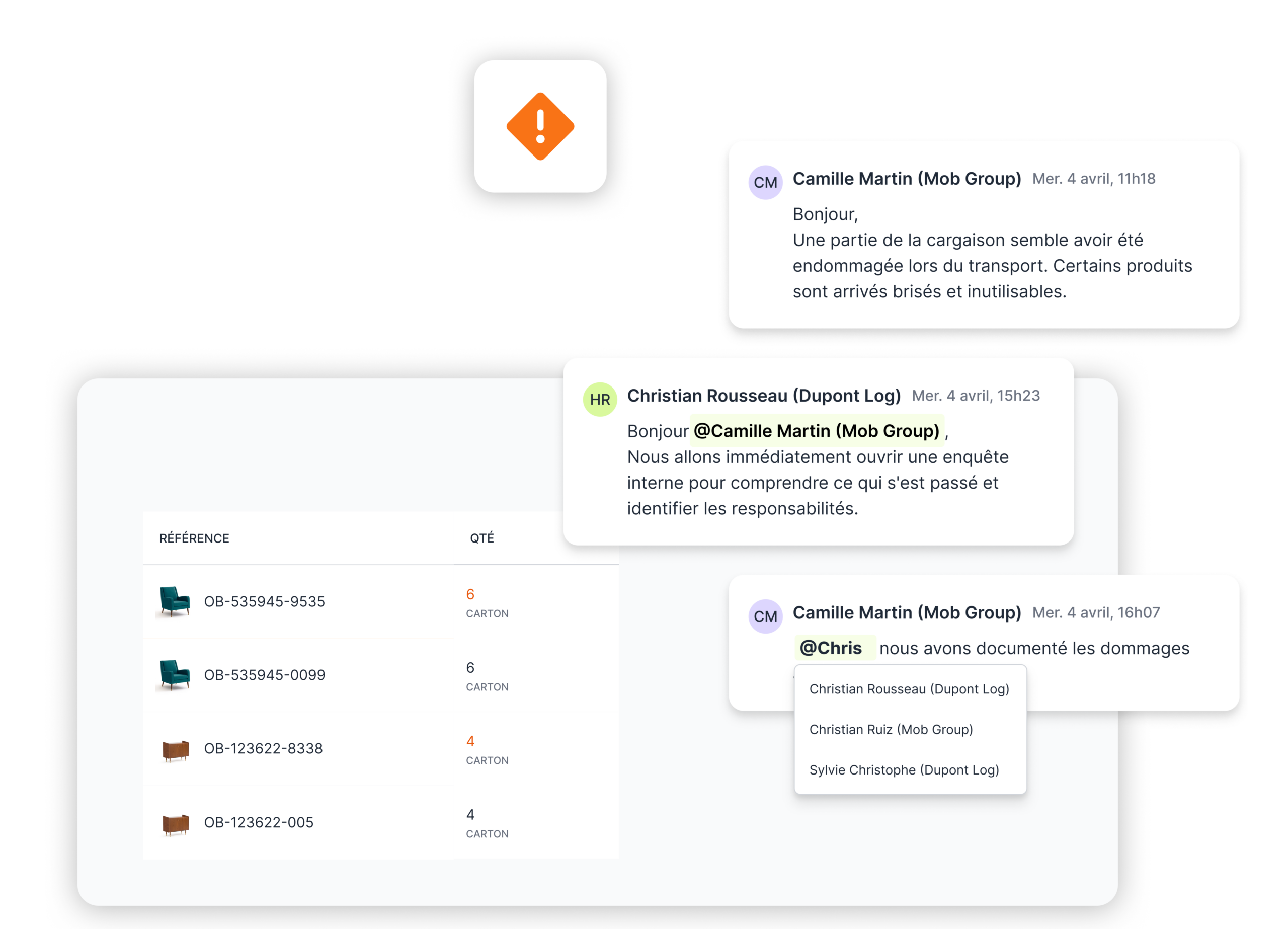 En cas de litige (réception, casse, écart…), toutes les informations sont centralisées :
